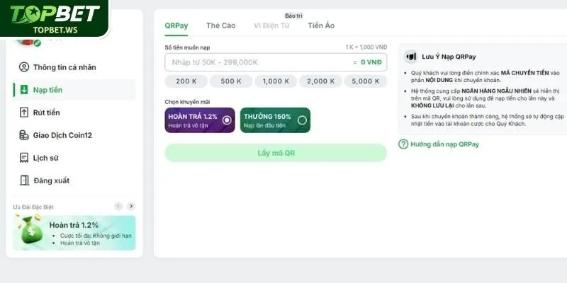 Nạp tiền Topbet là quy trình đơn giản nhưng yêu cầu người chơi phải thao tác chính xác và tuân thủ quy định của nhà cái. Với các phương thức thanh toán đa dạng như ngân hàng, ví Momo, Codepay, thẻ cào và tiền ảo, hệ thống mang đến sự linh hoạt tối đa cho người dùng ở mọi khu vực.