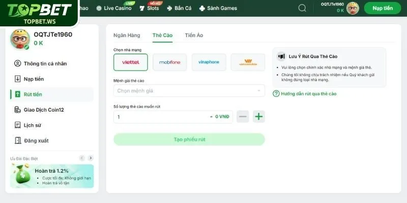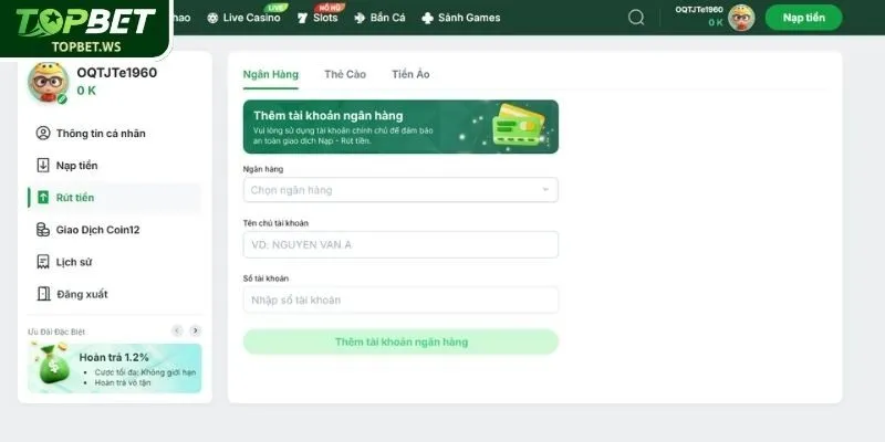 Topbet hỗ trợ người chơi rút tiền linh hoạt thông qua nhiều hình thức khác nhau, trong đó phổ biến nhất là qua ngân hàng và USDT (tiền ảo). Cả hai phương thức đều được thiết kế đơn giản, tốc độ xử lý nhanh và bảo mật tuyệt đối.